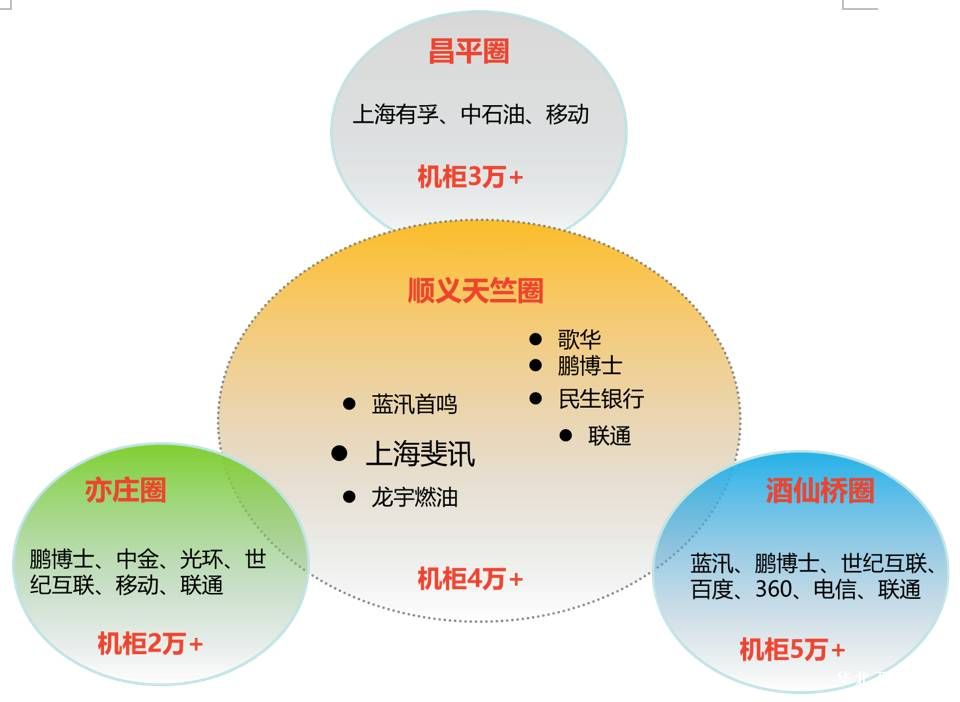 昌平数据中心圈主要分布有上海有浮、中石油、移动等,机柜规模约3万多个。后来居上的顺义圈在建和已建成的数据中心主要有上海斐讯、蓝汛、龙宇燃油、歌华、鹏博士、民生银行、联通等,机柜规模约4万多个。